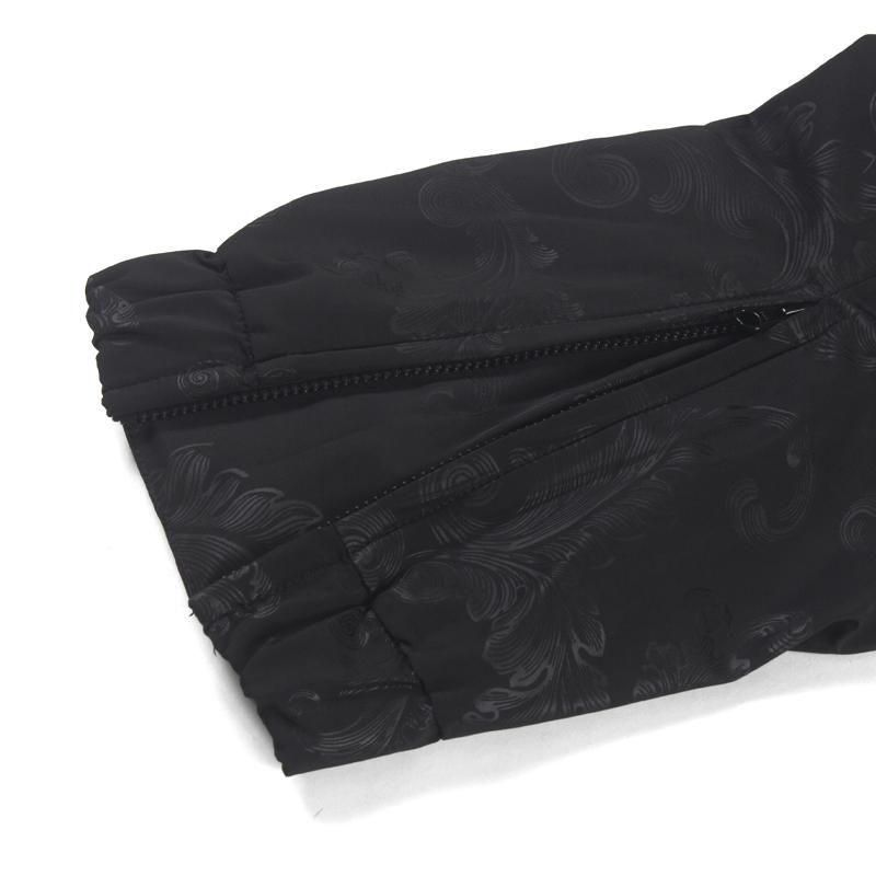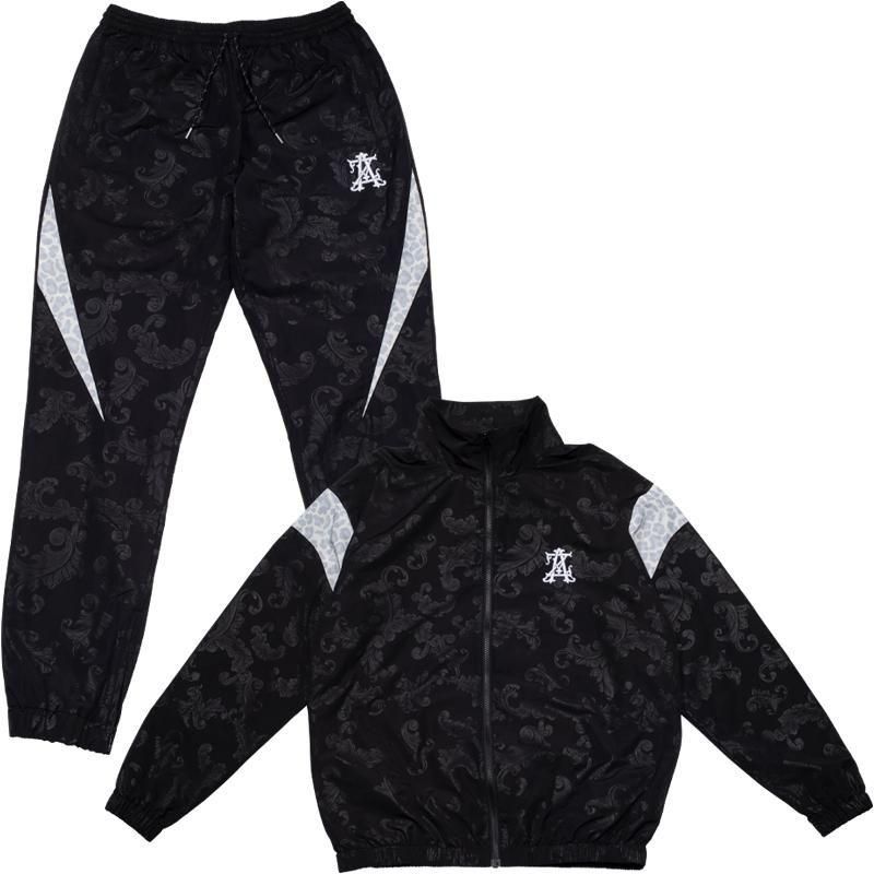 バロック柄をボディと同色で施した総柄デザインのナイロンセットアップ。袖、パンツのサイドの切り返しはレオパード柄を使用。