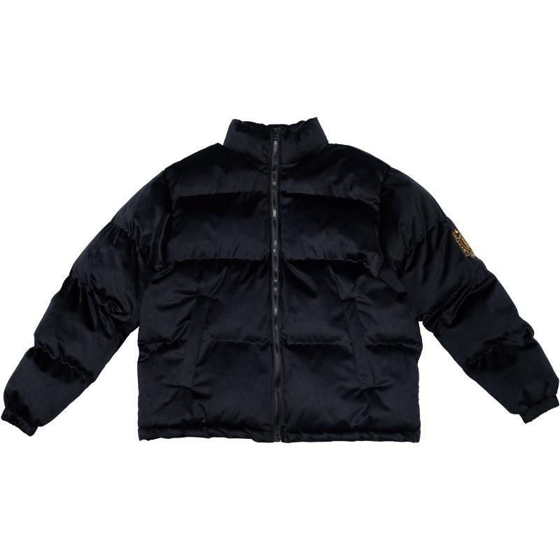 ベルベット素材を使用したシンプルなパフジャケット、袖に付いた金糸エンブレムワッペンが映える1着。